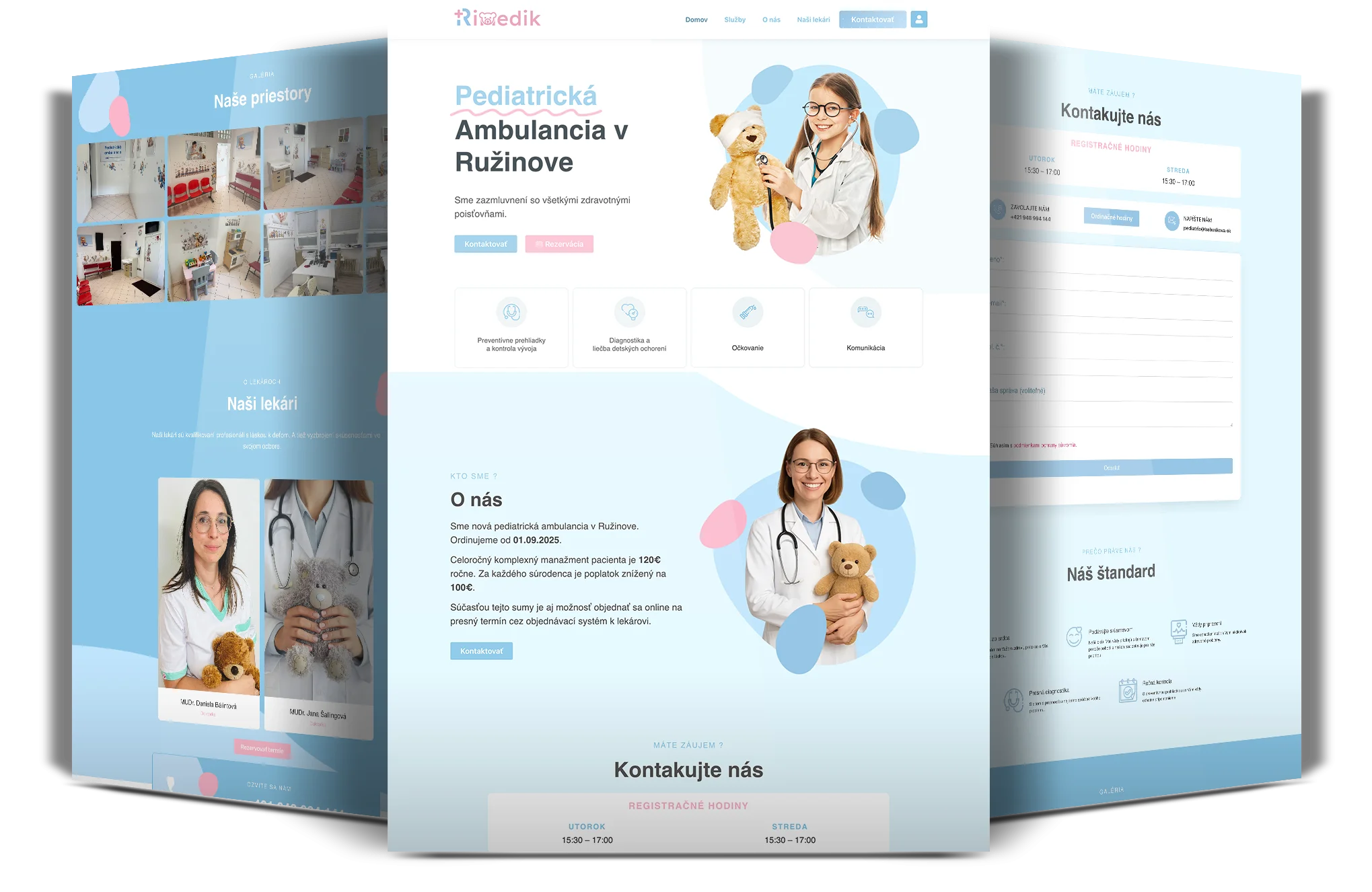 Web pediatricka.eu sme pripravili ako miesto, kde rodičia nájdu všetko potrebné na jednom mieste. Stránka pôsobí príjemne a upokojúco, ponúka informácie o službách aj lekároch a umožňuje jednoduchú rezerváciu termínu. Je prehľadná, dôveryhodná a prináša istotu pri starostlivosti o deti.